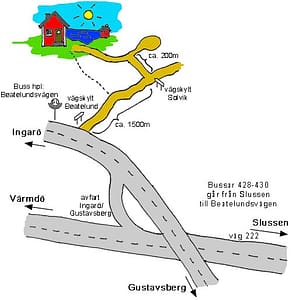 When you get off the bus go back about 15 meters in the direction the bus came from and turn onto Beatelundsvägen and walk up the hill past the gravel parking lot and continue on towards Solvik. After about 5 minutes you can choose to take the shortcut to the left through the woods (by the sign that says Solvik) but after dark, we recommend that you follow the road all the way. To follow the road after you have passed the gravel parking lot you want to turn left everytime the road divides until you have arrived. Walking time is about 15 minutes through the woods or about 20 minutes along the road. If you have a lot of luggage with you then talk to a friend who has a car or the autocrats ahead of time about being picked up by the gravel parking lot near the bus stop.